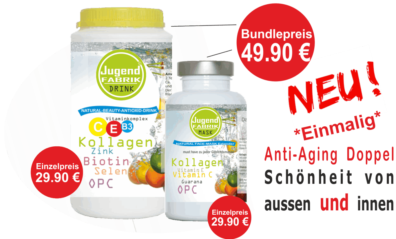 Alle selbst hergestellten Masken sind 100% natürlich, ohne Konservierungsstoffe und Chemie. Unser Jugendfabrik Mask Extender© gehört auf jeden Fall zu jeder Maske und 1 Teelöffel sollte immer dazugegeben werden. Die Wirkung jeder natürlichen Gesichtsmaske wird wie ein Multiplikator verstärkt. Als weiteren Multiplikator empfehlen wir dir den Jugendgfabrik Antioxid Cell Lift Drink©. Täglich ein Glas trinken. Mit dem Superbundle greifst du das Altern von aussen und innen an. Und das Beste, alles ist 100% Natur, auch unsere Zutaten. Das enthaltene natürliche Kollagen ist Grundbestandteil unserer Haut, die äussere Zufuhr mit zunehmendem Alter immer wichtiger, jedoch in keiner Frucht enthalten. Die weiteren enthaltenen natürlichen Antioxidantien wirken als weiterer Maskenbooster.
